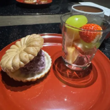 It is a newly designed Japanese-style hotel. The large bathhouse is also very beautiful. It is also newly designed. The Western-style rooms are not big but very beautiful. The view from the open-air bath is pretty good. You can open the sliding door connecting the garden in the lobby and go out. The garden is very large, with several smoking hot springs and red leaves. It is as beautiful as a fairyland, but it is quite cold and windy, so you cannot stay outside for too long, which is a pity. Such beautiful garden scenery can also be seen from the room terrace. The dinner was very delicious, especially the yusheng and the last dessert of a taro ice cream ball sandwiched between two pieces of pancake. The dining area is also very beautiful, with a separate room with glass sliding doors.