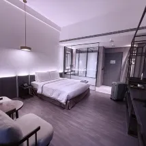 Although the hotel isn't right in the city center and is a bit of a distance from the train station, it's wonderfully quiet. The hotel itself is new and clean, and the rooms feature smart controls for lighting, curtains, and more. While the swimming pool isn't large, the water is spotlessly clean, and it's evident that daily maintenance is well-handled. The staff members were all very friendly and helpful; we even received a text message reminder the day before check-in. The complimentary afternoon tea snacks and the 7 PM tofu pudding service in the evening were both very thoughtful touches. The breakfast selection and quality were excellent, truly delicious, and the coffee was good too. All beverages in the mini-fridge were complimentary, and the small cookies were tasty 😋. The room size was just right, the bed was comfortable, and having a hot spring bath on the balcony with good ventilation and an open view made for a truly comfortable stay.