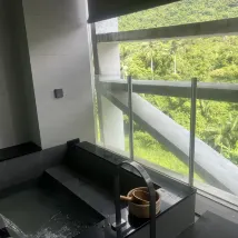 The room was fully equipped with smart features, and although some of the devices were a bit clunky, it still made for a fantastic experience. The sound system was great, and the room itself was large and comfortable! The communal activity area even had a waterslide! While it was on the smaller side, even I, a 'big kid' at 168cm, had a blast on it. The ground-floor terrace pool was huge and wonderful, offering plenty of Instagrammable seating. There was even a separate smaller pool area! It's absolutely perfect for a family getaway with children, and the soundproofing is excellent, so you never have to worry about disturbing anyone. The in-room hot spring was superb! The tub was so spacious it felt like it could easily accommodate five people. The only minor downside was the bed, which was quite firm. However, for those who prefer a firm mattress, it's a major plus and a refreshing change from hotels that only feature soft beds.