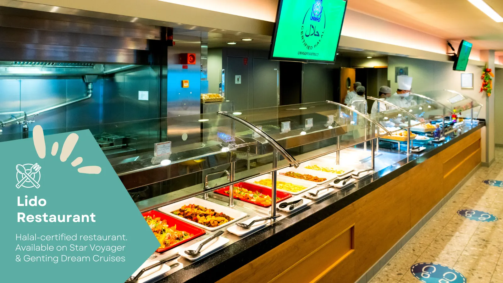 The Lido Restaurant on the Genting Dream Cruise, departing from Singapore, is a buffet-style dining venue offering a diverse range of international cuisines. It caters to various dietary preferences, including vegetarian and halal options. The restaurant provides a casual dining atmosphere, making it suitable for families and groups. With its wide array of dishes, guests can enjoy breakfast, lunch, and dinner while experiencing the scenic views from the cruise.