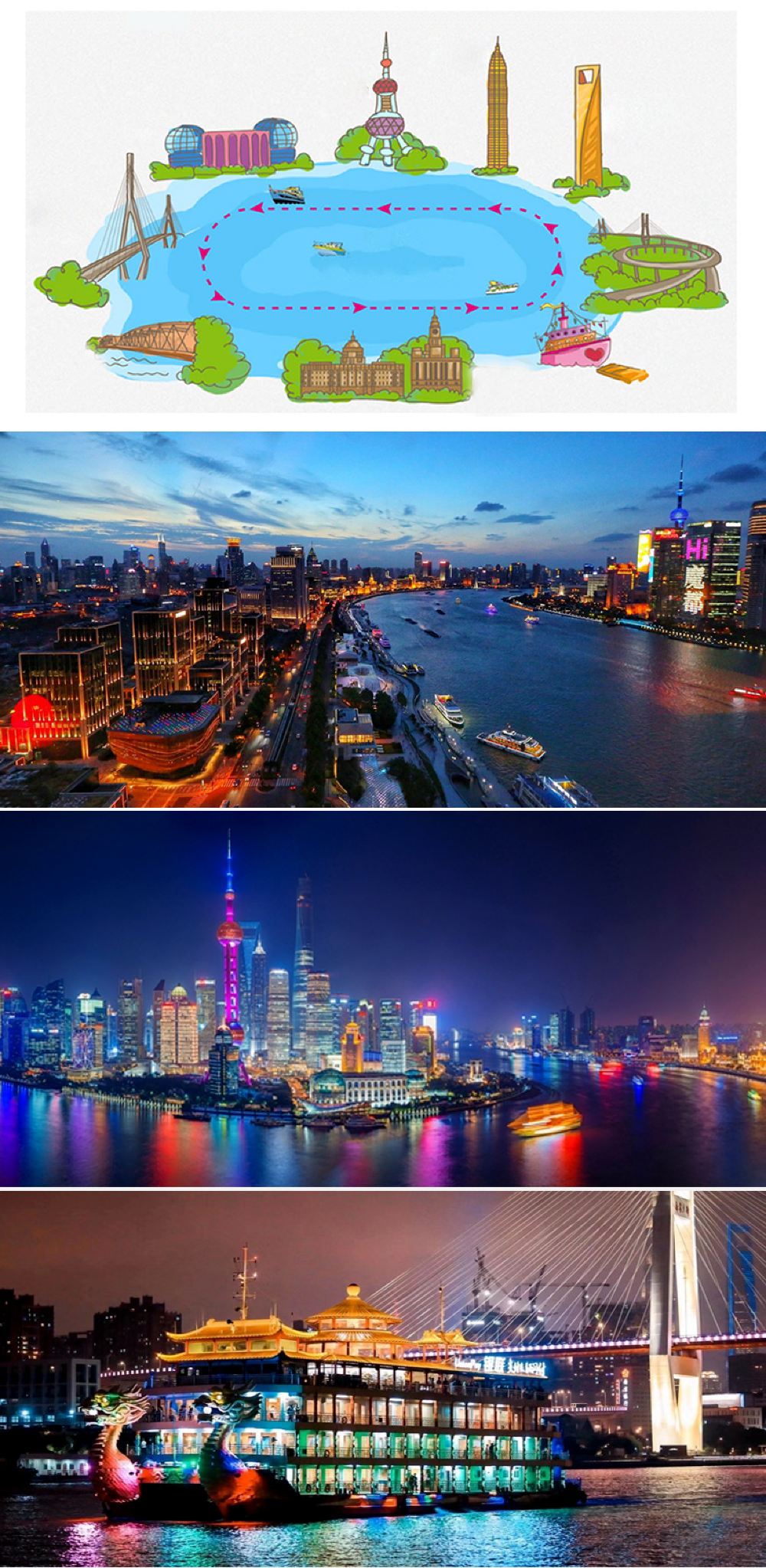 Shiliupu Pier — Jambatan Nanpu — Tebing Sungai Huangpu — Jambatan Lupu (pusing balik dan belayar di sebelah Pudong) — Pusat Ekspo — Pusat Kebudayaan Mercedes-Benz — Tebing Sungai Pudong — Lujiazui — Menara Oriental Pearl — Dermaga Xinhua (pusing balik dan belayar di sebelah Puxi) — Dermaga Jalan Qinhuangdao — Bund Utara — Jambatan Waibaidu — Kompleks Bangunan Bersejarah Bund — Kembali ke Shiliupu Pier