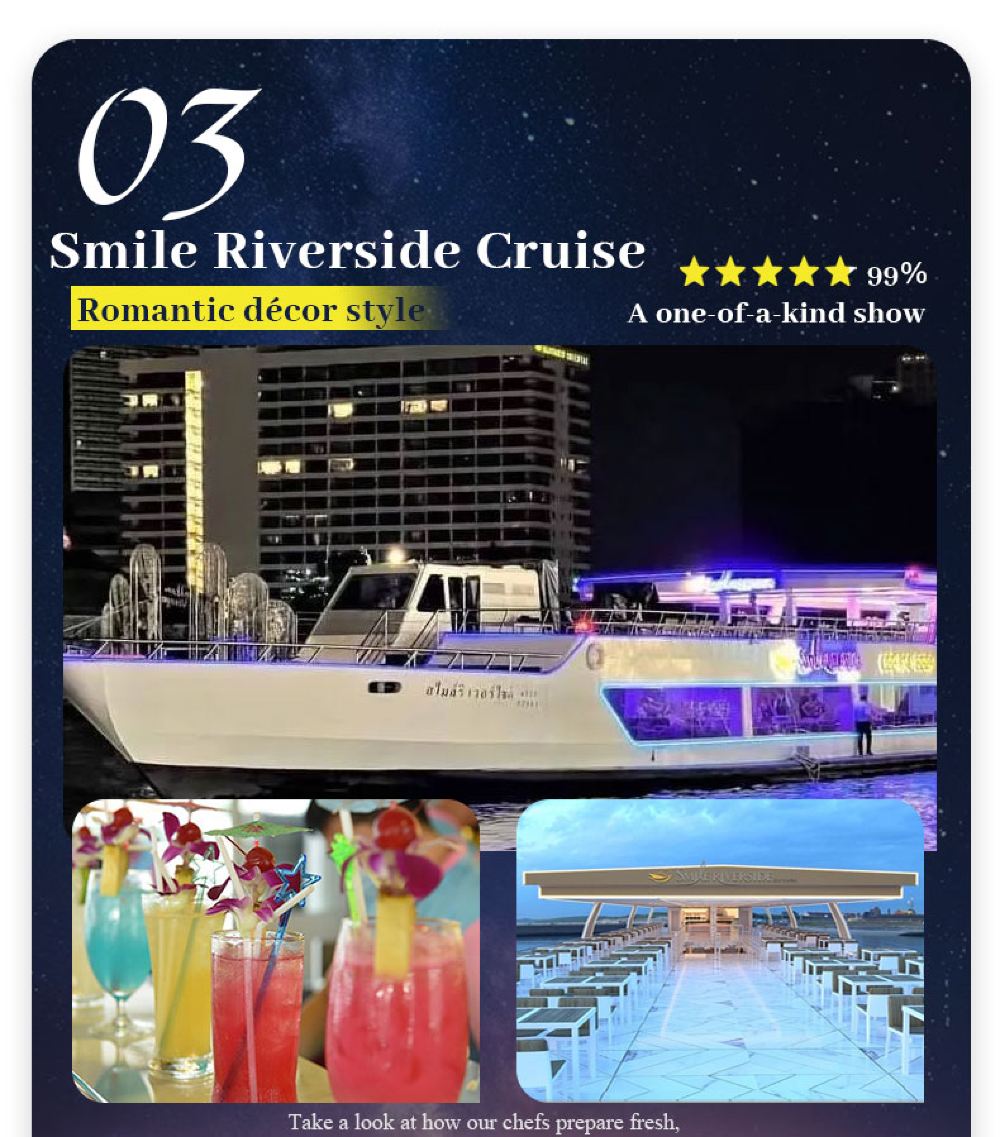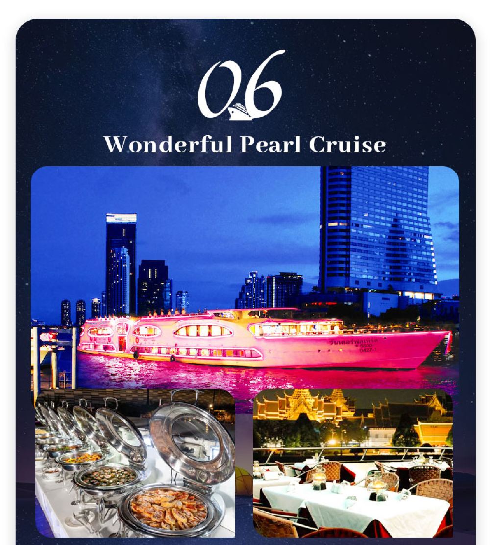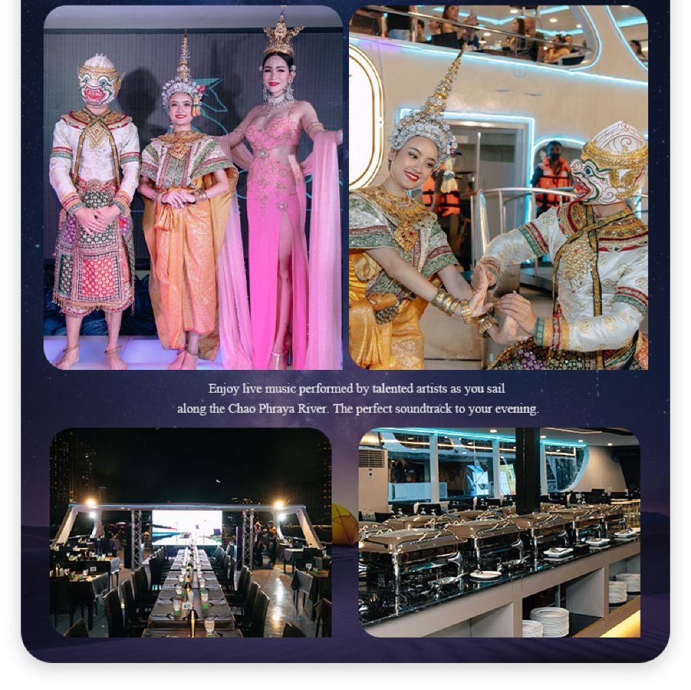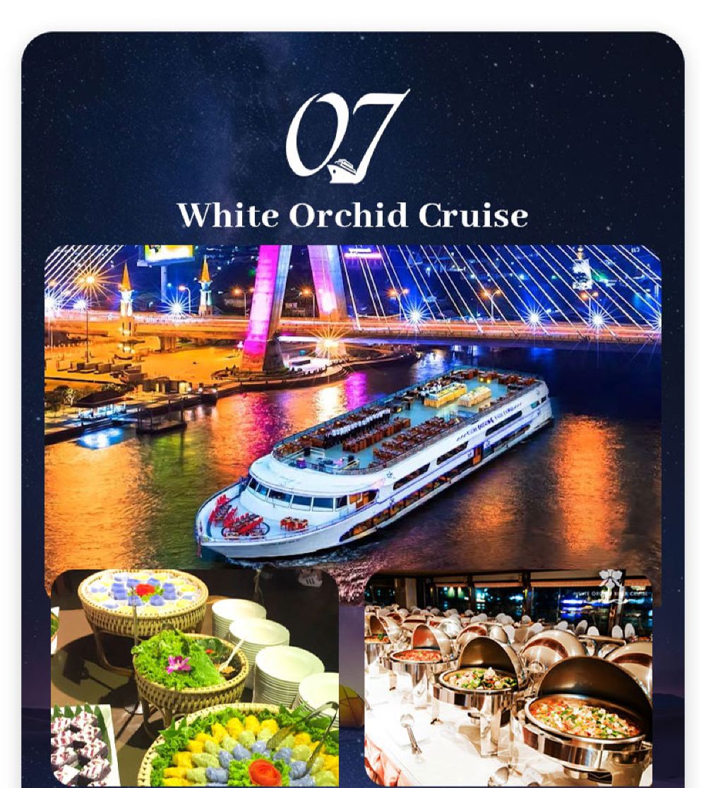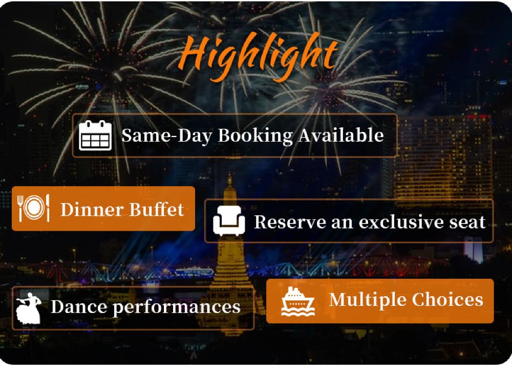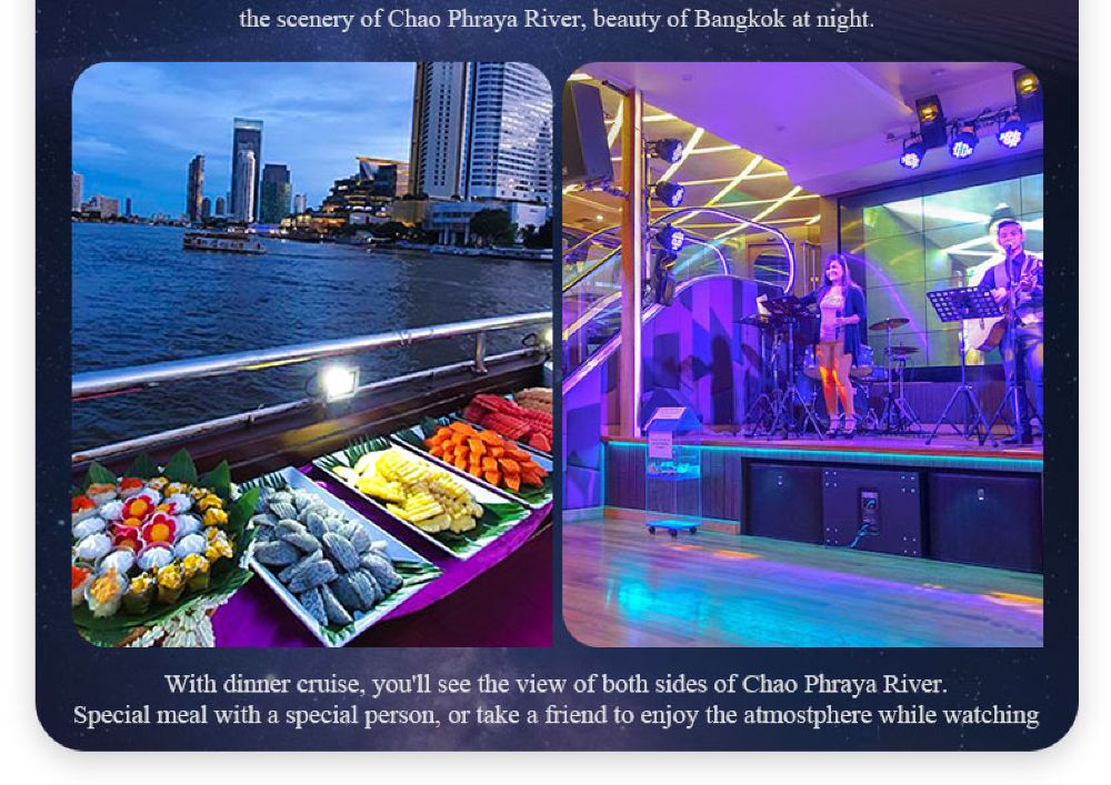 Makanan yang lazat, nyanyian dan tarian yang berwarna-warni, kapal persiaran mewah yang belayar di Sungai Chao Phraya dan menikmati makan malam romantis diterangi cahaya lilin. Terdapat berbilang jenis kapal untuk dipilih, masing-masing dengan tema dan ciri yang berbeza.