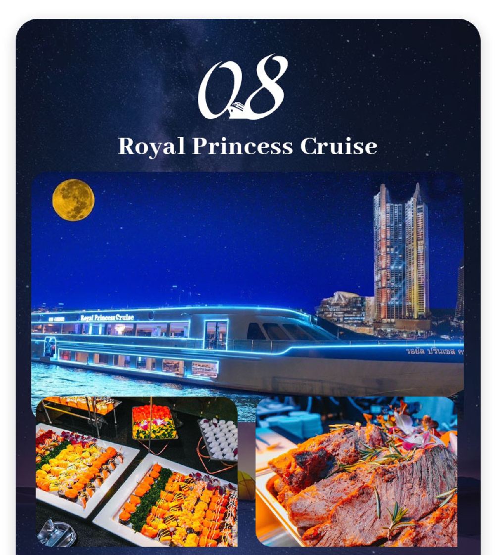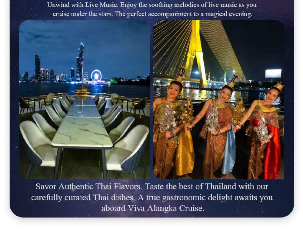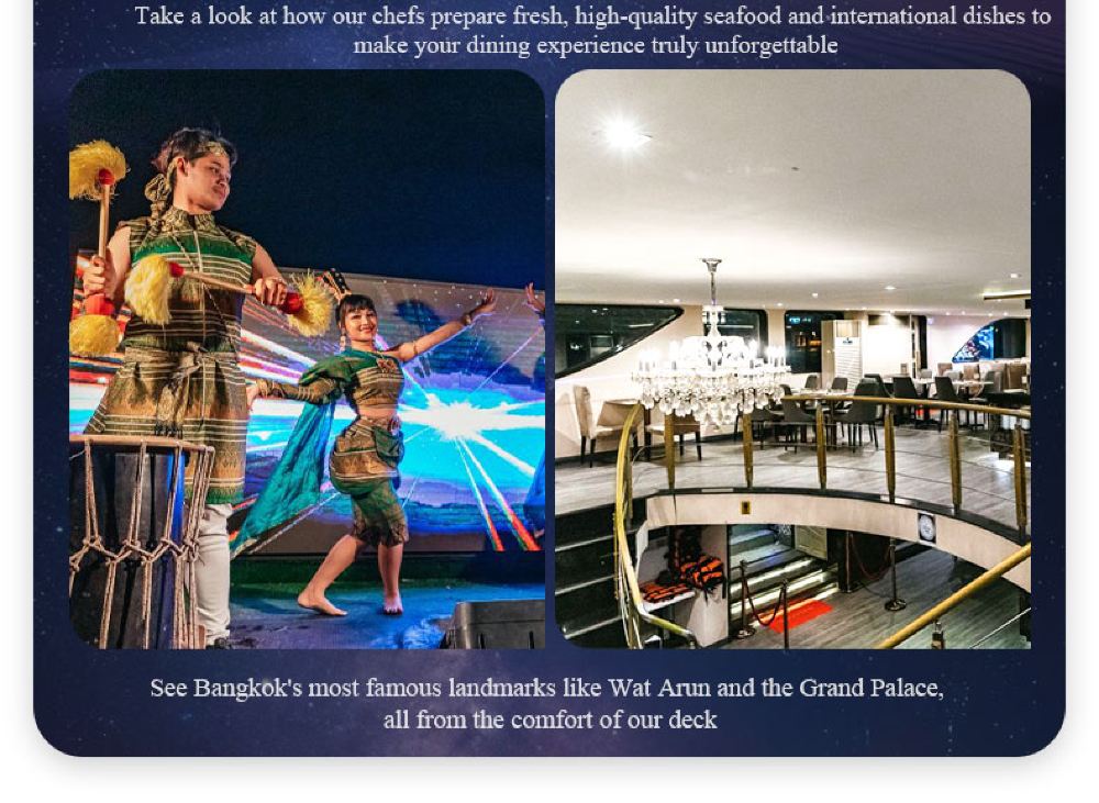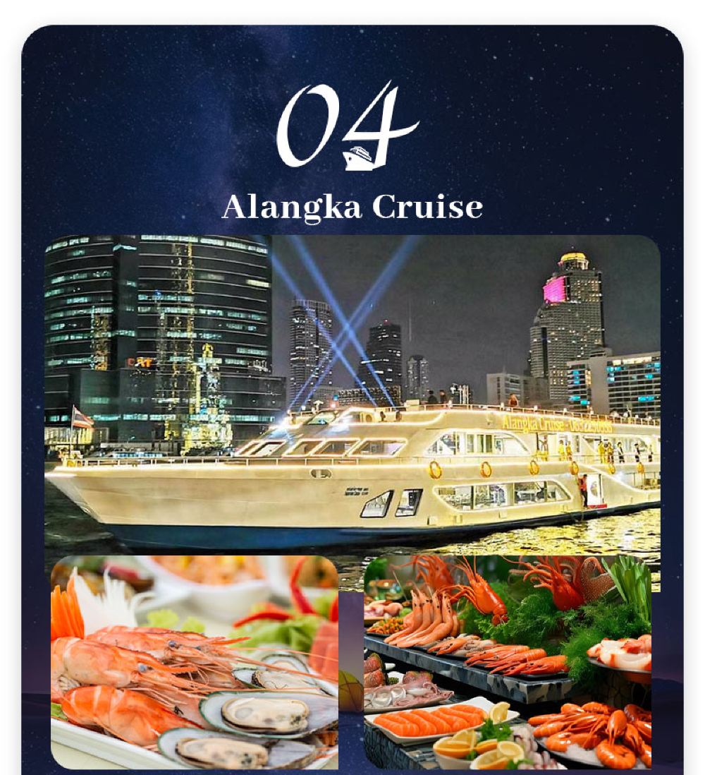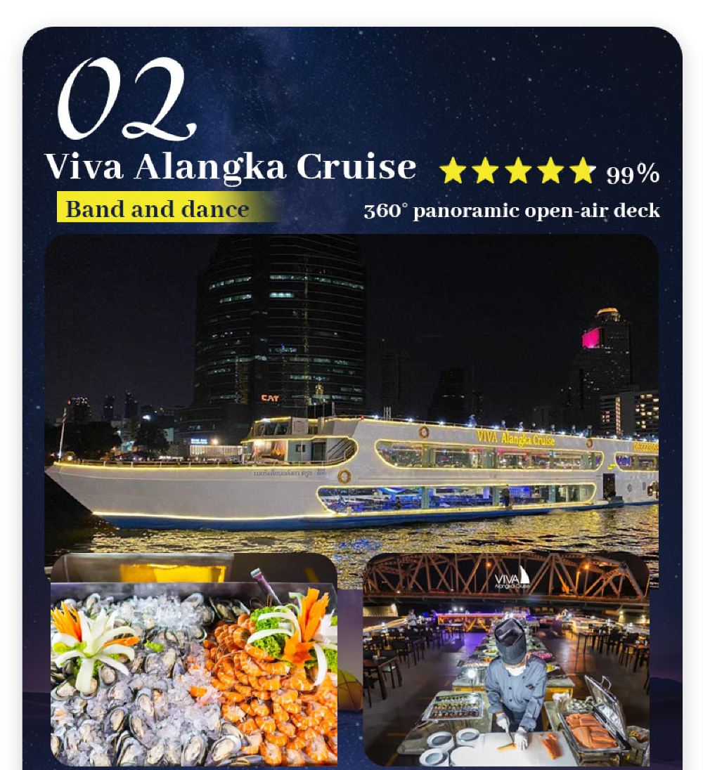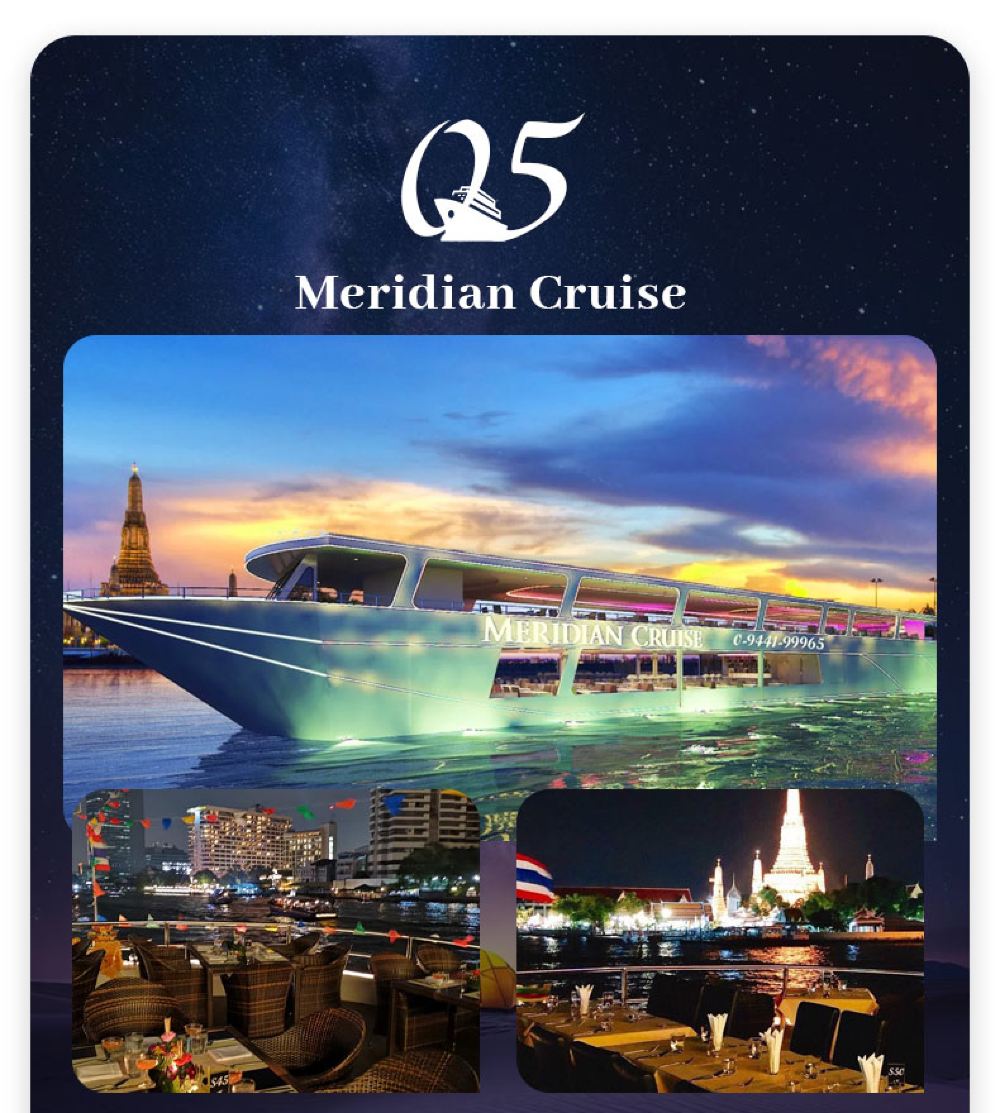 Makanan yang lazat, nyanyian dan tarian yang berwarna-warni, kapal persiaran mewah yang belayar di Sungai Chao Phraya dan menikmati makan malam romantis diterangi cahaya lilin. Terdapat berbilang jenis kapal untuk dipilih, masing-masing dengan tema dan ciri yang berbeza.