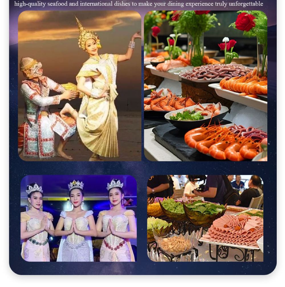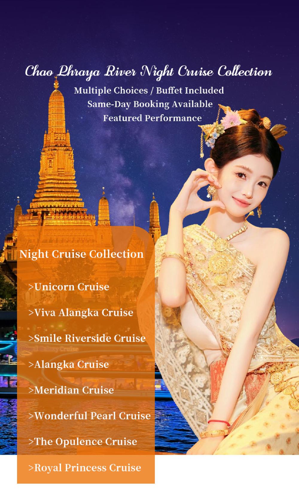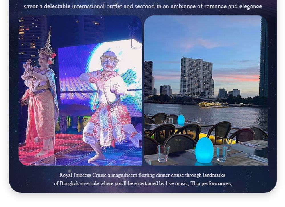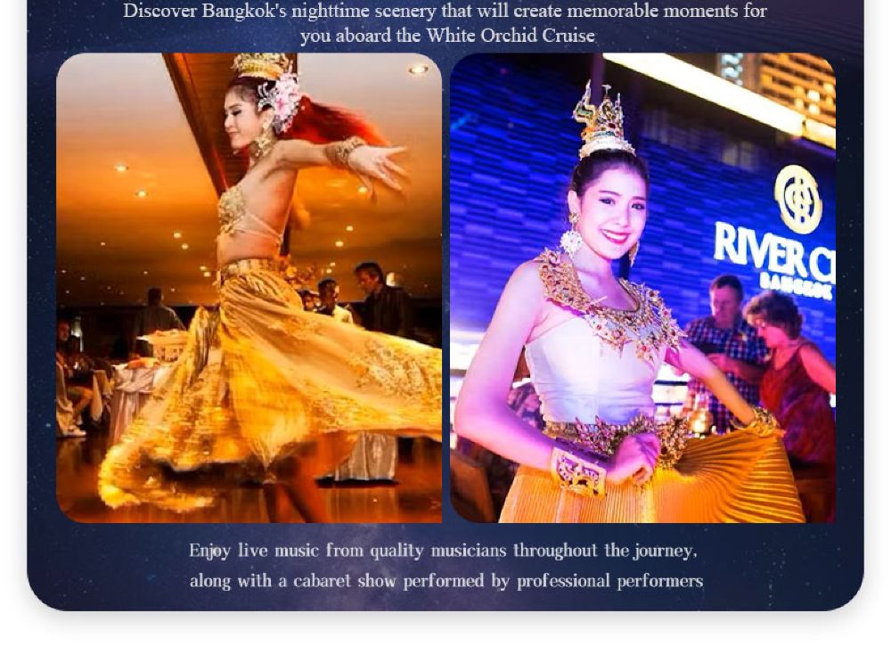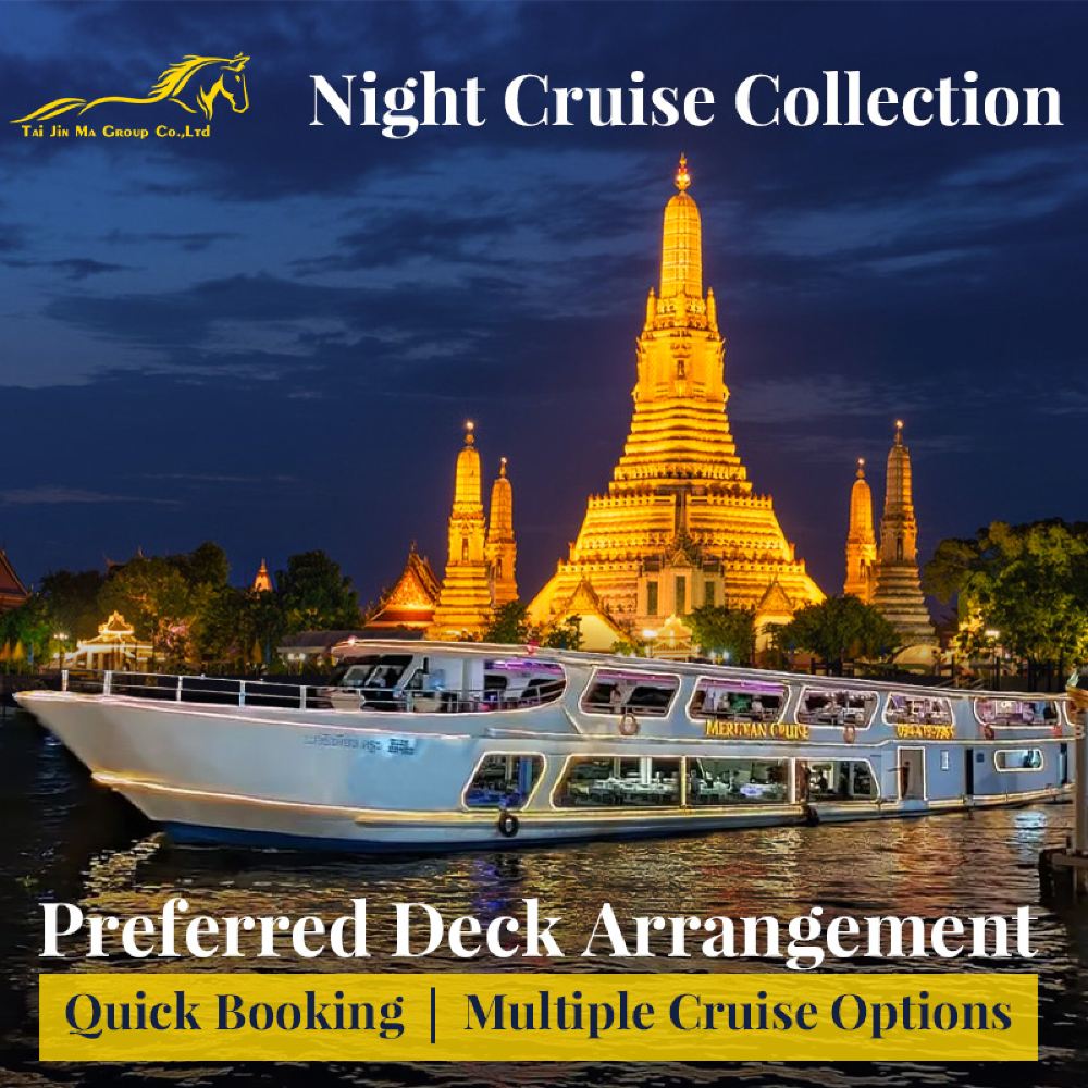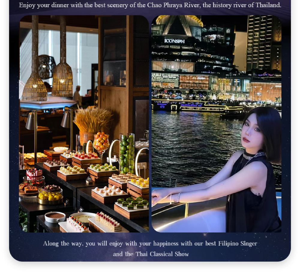 Makanan yang lazat, nyanyian dan tarian yang berwarna-warni, kapal persiaran mewah yang belayar di Sungai Chao Phraya dan menikmati makan malam romantis diterangi cahaya lilin. Terdapat berbilang jenis kapal untuk dipilih, masing-masing dengan tema dan ciri yang berbeza.