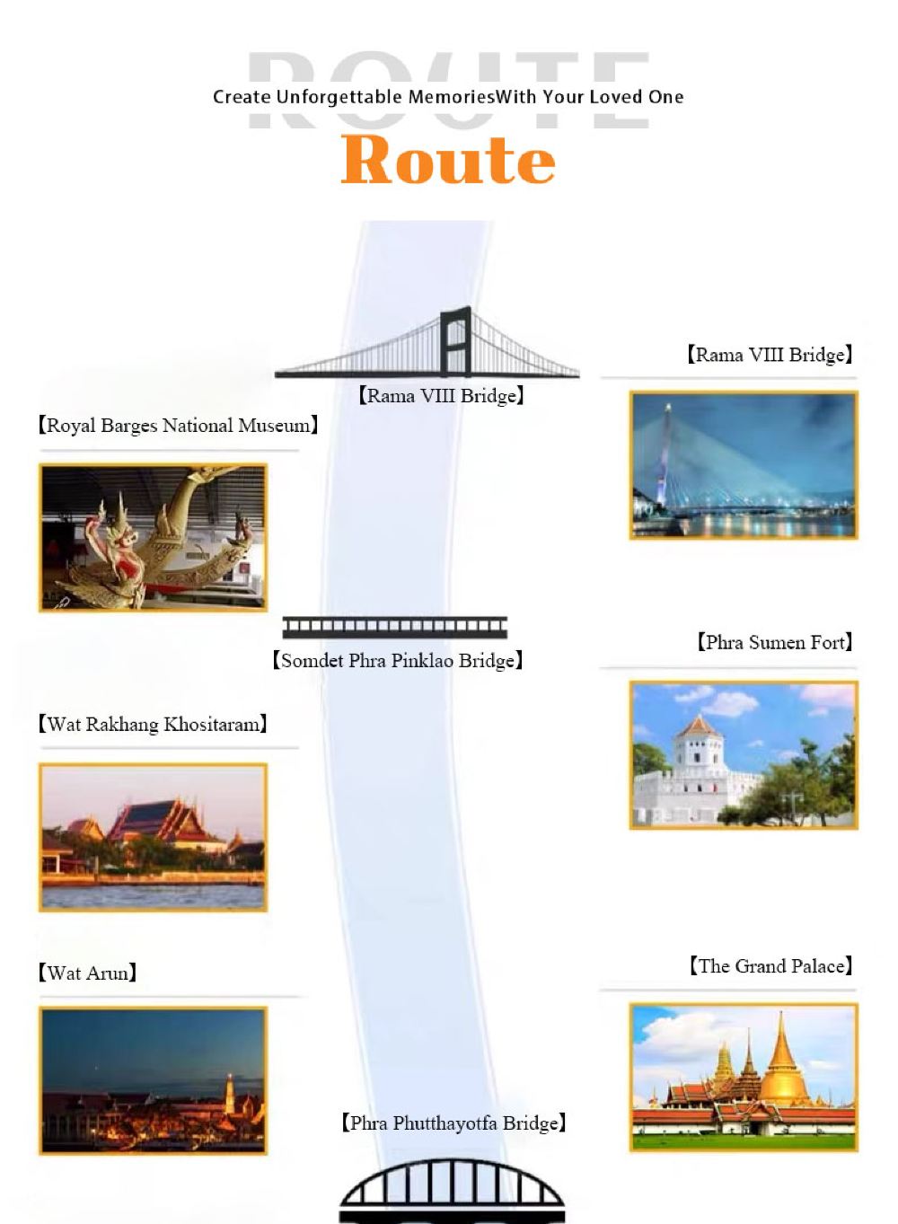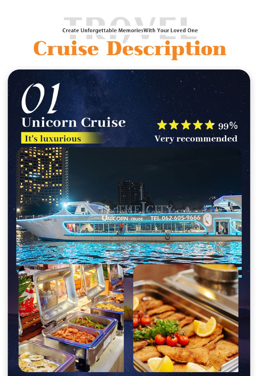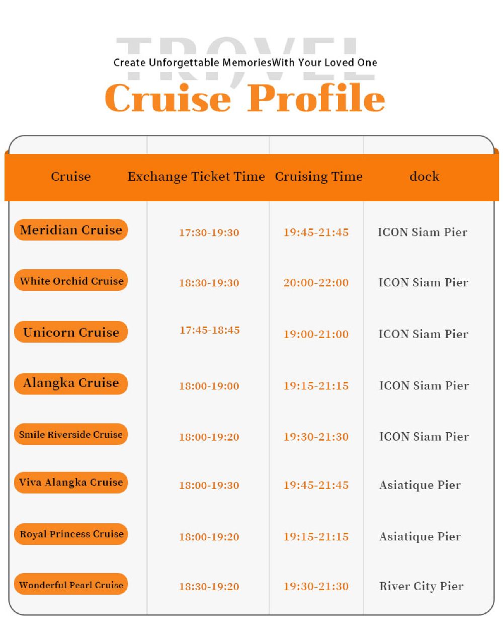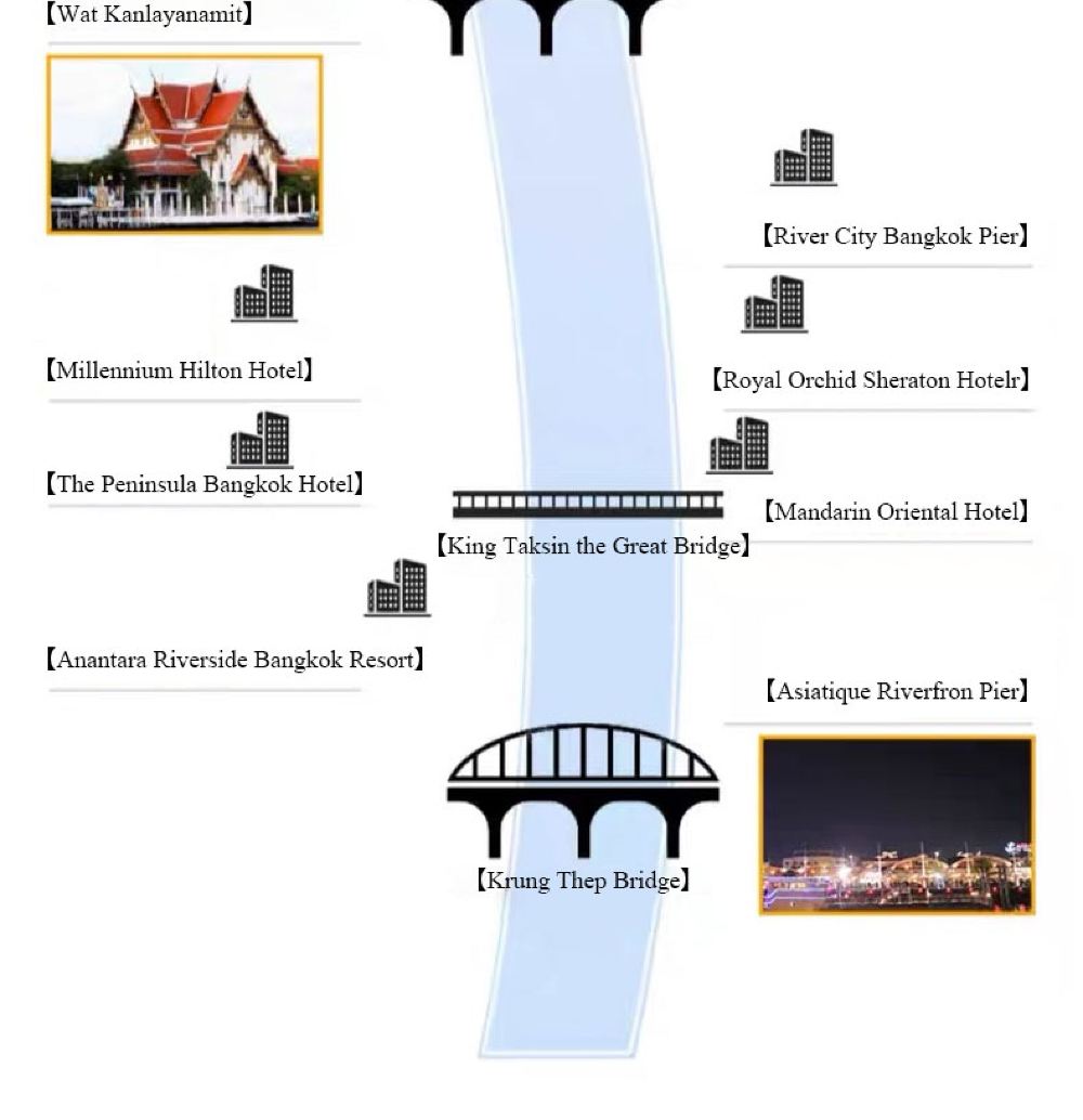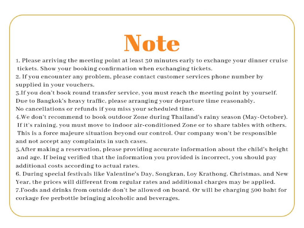 Makanan yang lazat, nyanyian dan tarian yang berwarna-warni, kapal persiaran mewah yang belayar di Sungai Chao Phraya dan menikmati makan malam romantis diterangi cahaya lilin. Terdapat berbilang jenis kapal untuk dipilih, masing-masing dengan tema dan ciri yang berbeza.