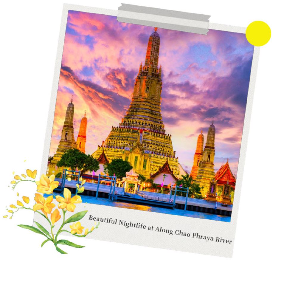 Sungai Chao Phraya adalah induk sungai Thailand.Pemandangan Sungai Chao Phraya pada waktu malam lebih cantik dan tidak boleh dilepaskan!